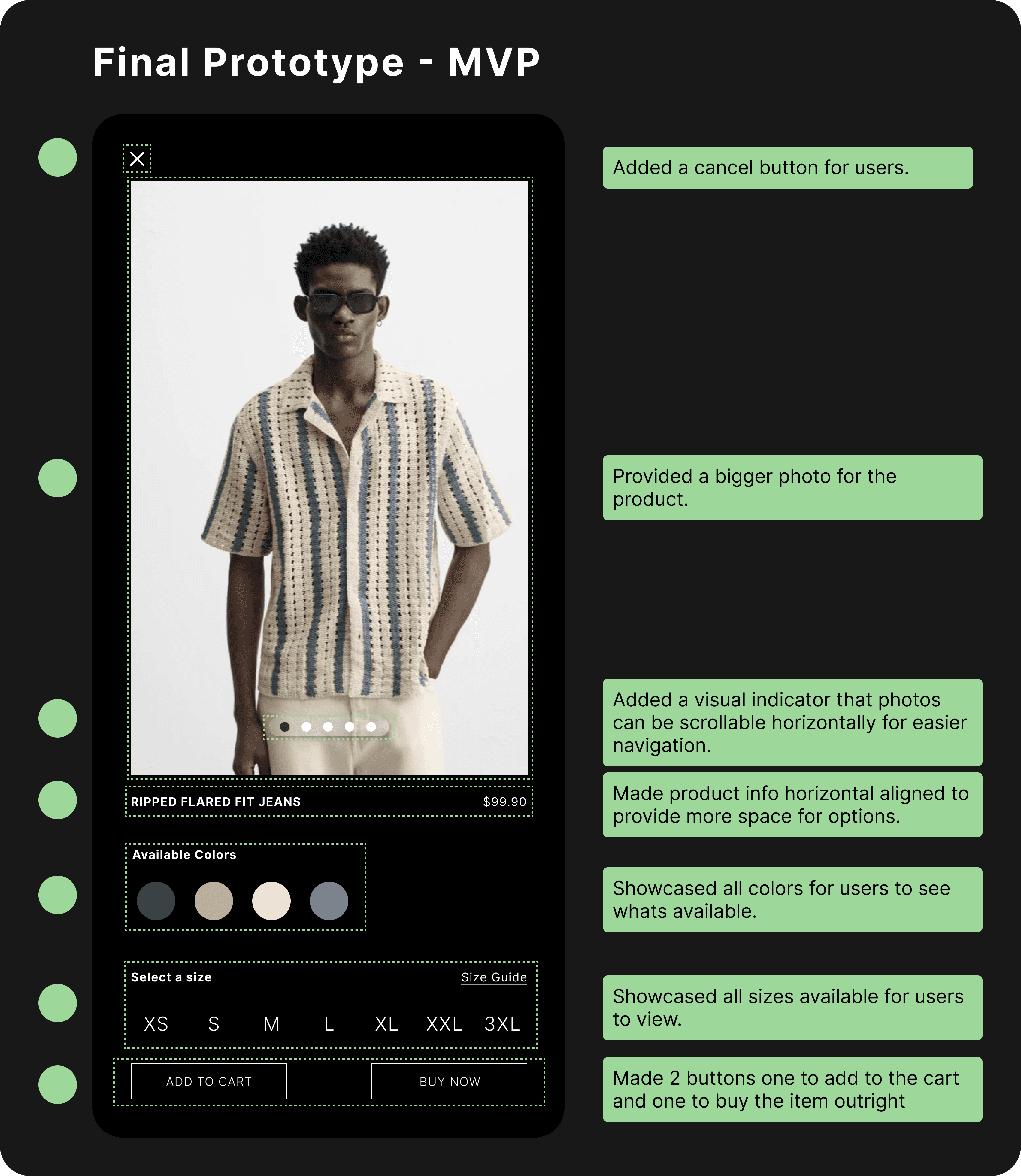 Usability testing showed that 8 out of 10 users confused the “Add” button with “Buy.” To reduce ambiguity, I added separate “Add to Cart” and “Buy Now” buttons.